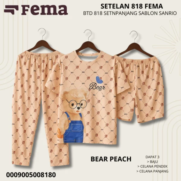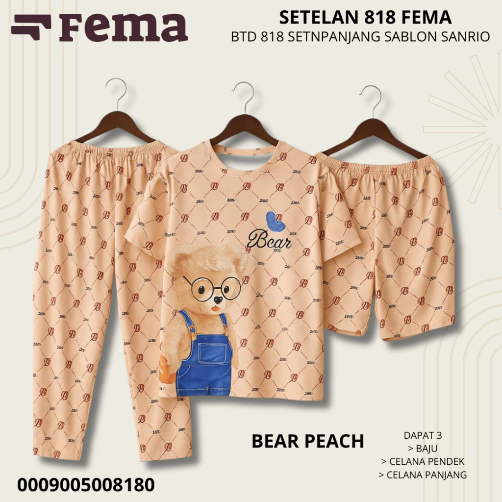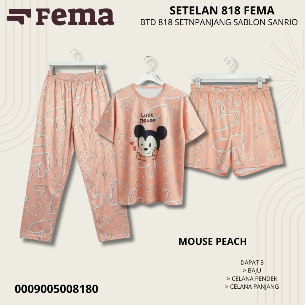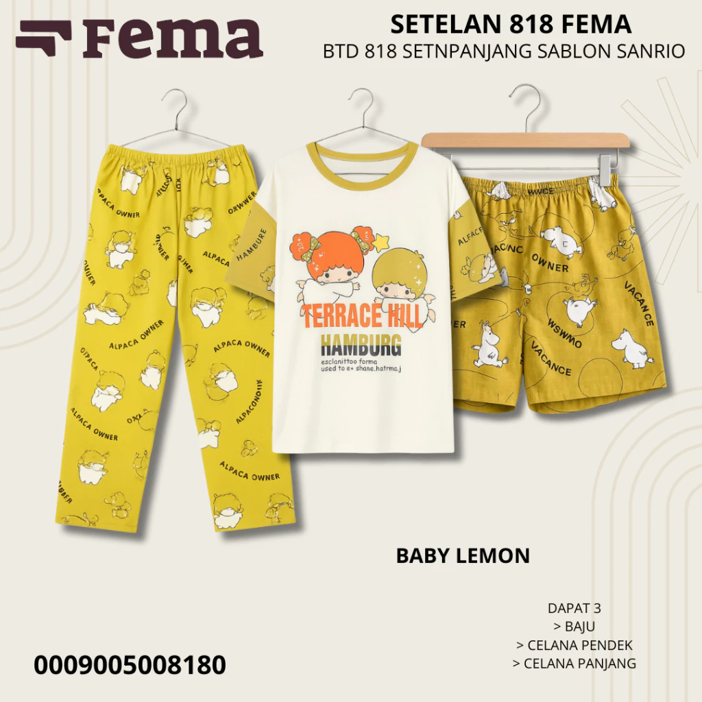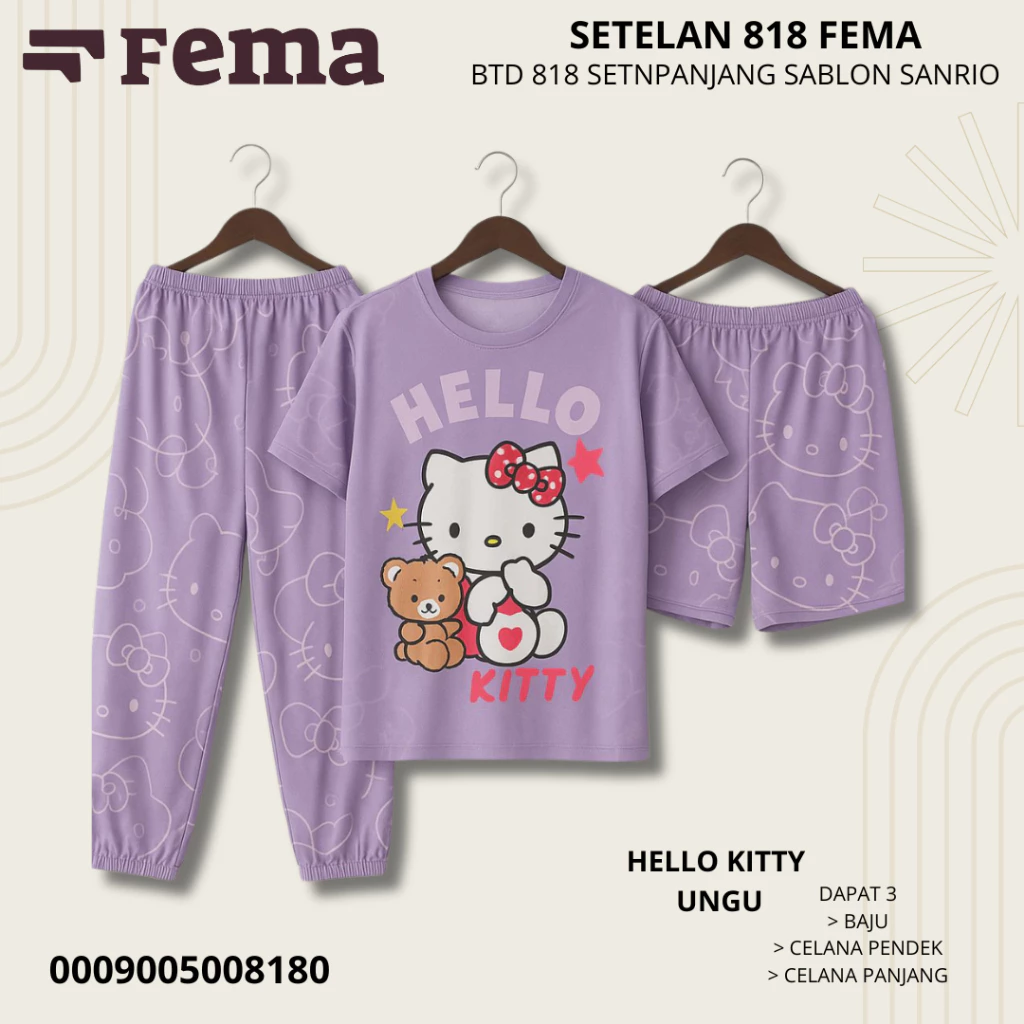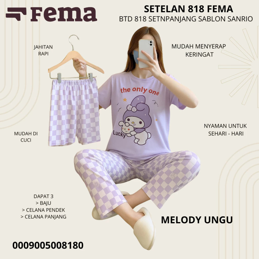 Dengan desain kasual dan sablon motif Sanrio yang manis, Baju Tidur 818 FEMA tidak hanya membuat tidur lebih nyaman, tapi juga memberi tampilan lucu dan stylish di rumah.