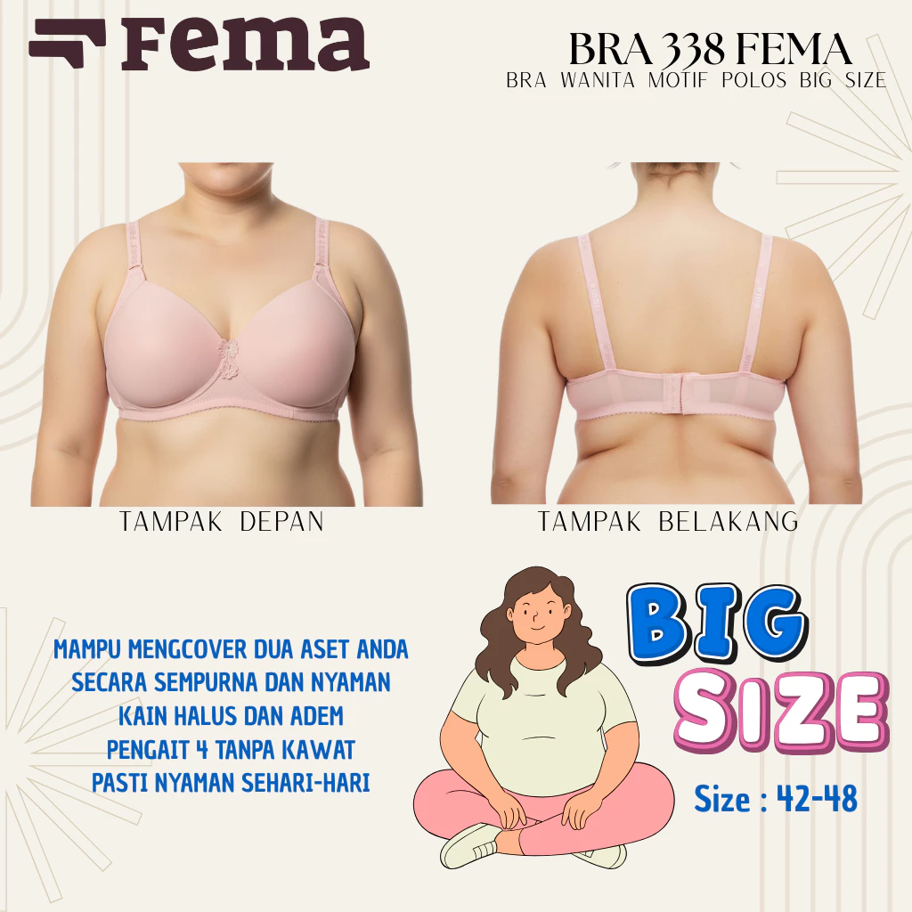 Bra Jumbo 338 FEMA hadir dengan desain tanpa kawat (wireless) yang memberi kenyamanan ekstra saat digunakan sepanjang hari. Cup D-nya memberikan daya topang yang ideal untuk bentuk dada yang lebih penuh, sementara empat kait belakang memastikan kekencangan dapat diatur sesuai kebutuhan.